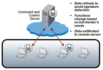 Um ein Botnet zu schaffen, nutzt der Bot-Herder Filesharing, E-Mails, Protokolle für Social-Media-Anwendungen oder auch andere Bots, um mit seinen bestehenden Bots vom Command-and-Control-Server aus ahnungslose Empfänger zu erreichen. Wird die schädliche Datei vom Empfänger geöffnet, meldet der Bot dies an den Command-and-Control-Server, wo der Bot-Herder Befehle an den infizierten Computer geben kann. Im Diagramm unten werden die Beziehungen in einem Botnet dargestellt:
