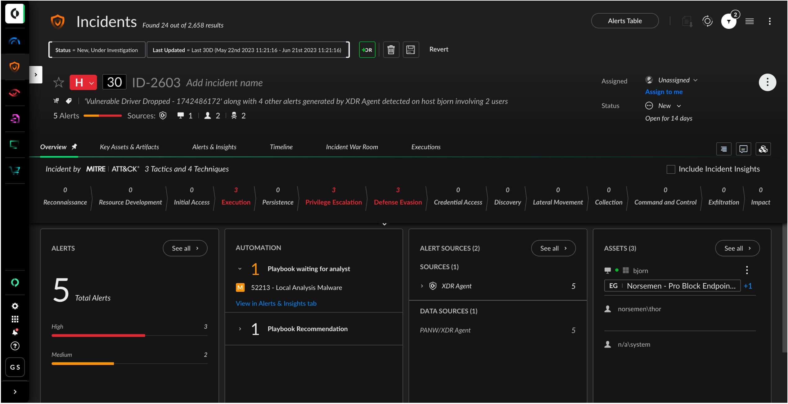 Abbildung 6: Mit MITRE ATT&CK-Schemata, zugehörigen Alarmen, Playbook-Status, Alarmquellen und Artefakten erhalten Sie einen tieferen Kontext zu Vorfällen